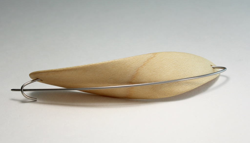 Carolyn YoungCurled Pod broochLaminated bent maple wood, stainless steel, 2018