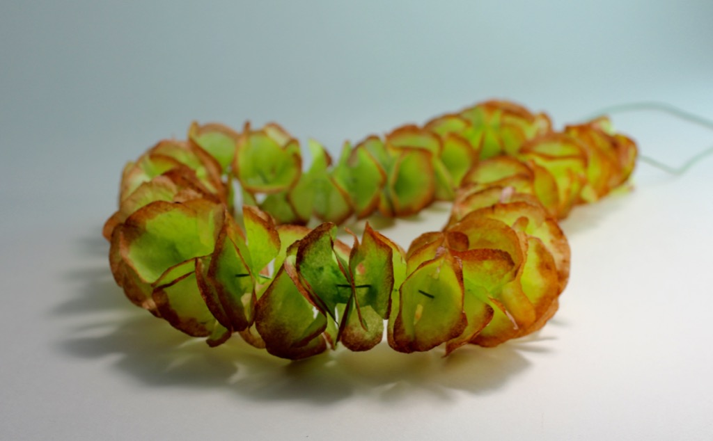Evanescent Bloom necklace Carolyn YoungEvanescent Bloom necklaceWashi, konnyaku, acrylic paint, hand-corded silk, 2019